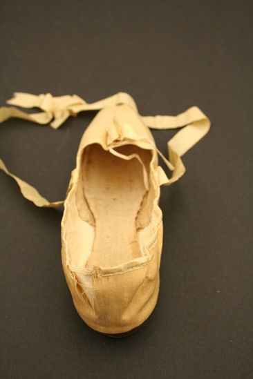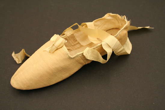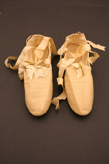 Twilled buff linen shoes, slipper style, with white satin bow, ties, and trim; brown leather soles with slight heel and rounded toe; heel lined with white leather; toe and inner sole lined with linen