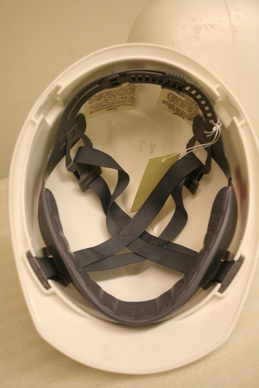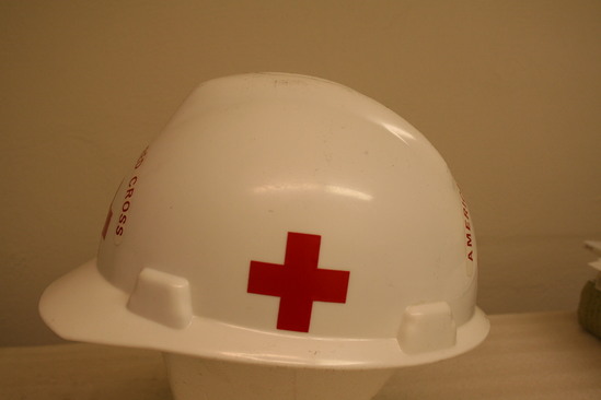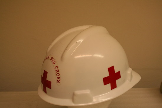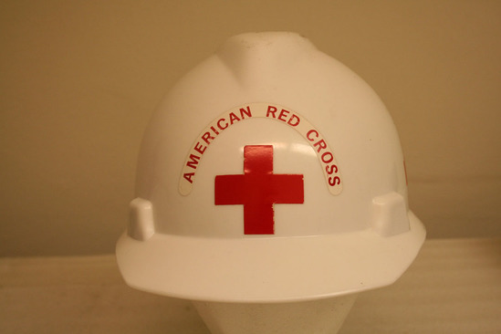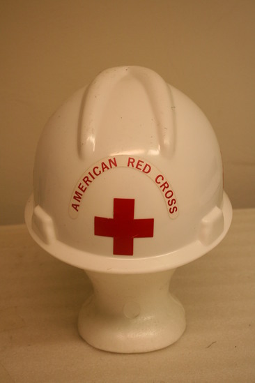Red Cross hard hat; white plastic body with four red crosses - one on each side; in front and back "American Red Cross" written in red above cross; plastic molded with raised V on top; inside has grey plastic head band with adjustable grey nylon straps.