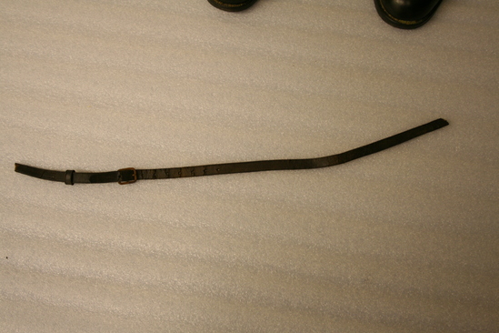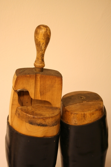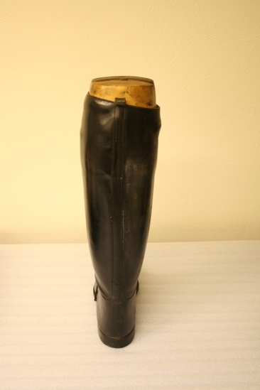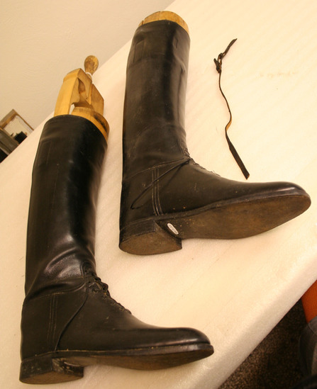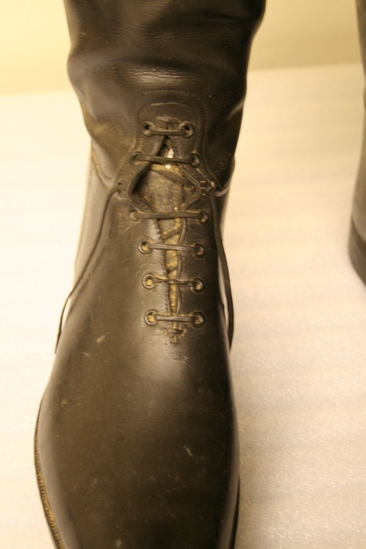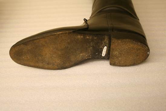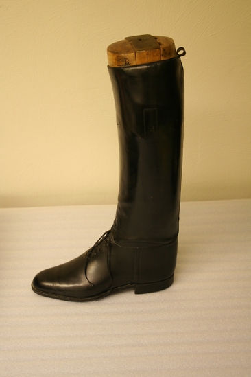 A-B: Pair of black leather riding boots. Knee high. Low heel. Seven pairs of holes with leather lace over top of ankle of each boot. Each boot contains wooden last that maintains shape of boot. Last on right boot has large wooden "key" projecting from top. Screws into top of each last to remove it from boot. C: thin black leather strap with buckle that came off of one of the boots. Leather torn in one area.