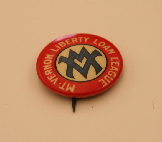World War I era pin. Round button with stick pin on back. Red border around white center. White lettering around border "MT. VERNON LIBERTY LOAN LEAGUE." Stylized blue "M" and "V" in center, overlapping.