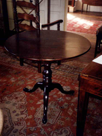 Cherry tilt top table, pedastal with bulbous ring turning, on three cabriole legs with slip feet, no birdcage, top in three pieces, probably frpom another table like a pembroke of drop leaf. Brass locking device on underside of table.