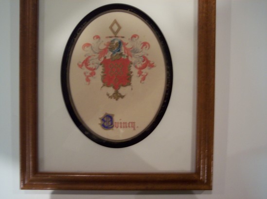 Maple colored wood frame enclosing under glass a white mat with oval center of original black glass, hand colored coat of arms of QUINCY. Quincy at bottom in fancy letter with rococo crest with red ground, gold diamonds on field and gilt edges, fancy torse on helm and crest of gold diamond. Glass black painted mat original.