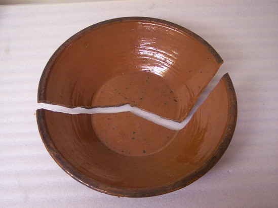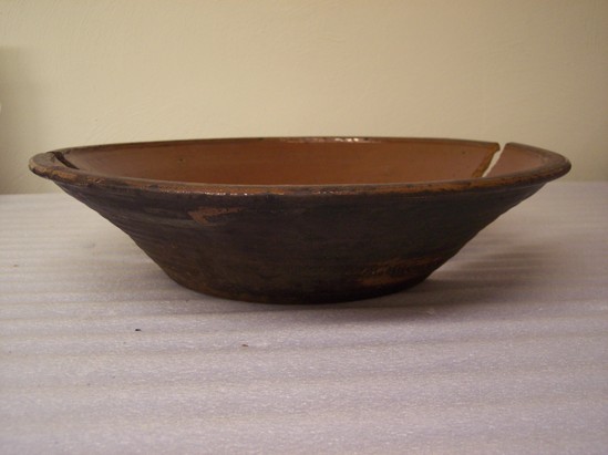 LARGE SHALLOW BOWL WITH CLEAR GLAZED INTERIOR, BLACK EXTERIOR. ROLLED RIM.