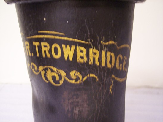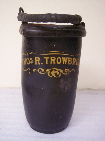 Leather fire bucket, hand sewn, black outside, brown interior, body compose of single piece of leather, sewn at back seam, base of circular piece sewn to body. Strap handle wrapped around iron rings at each end, rings attached to body by loops of leather that are sewn into the rim. On the front in gold stenciled lettering around a cartouche: "THOs R. TROWBRIDGE"
