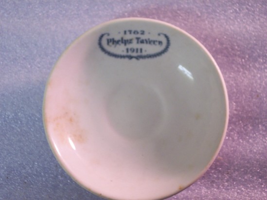 White saucer with green writing stating, "1782/Phelp's Tavern/1911" and framed in a green garland.