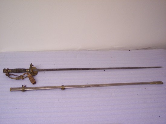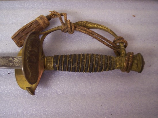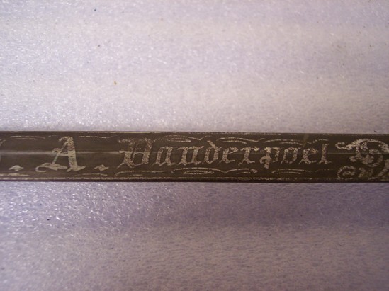 Sword has gilded handle and guard. Black leather grip and brown leather tassel. Blade of sword has decoration on handle - one side marked "J.A. Vanderpoel" and other side "N.Y." on other. "Ridabock & Co. NY" engraved at top of blade near handle. Scabbard silver metal with brass tip and two brass bands at intervals on scabbard, brass rings attached to bands