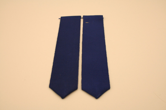 Pair of navy blue grosgrain American Red Cross ribbon epaulets. Long and rectangular in shape. One end pointed. Two epaulets are sewn together at one end by a single thread.