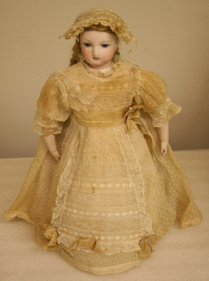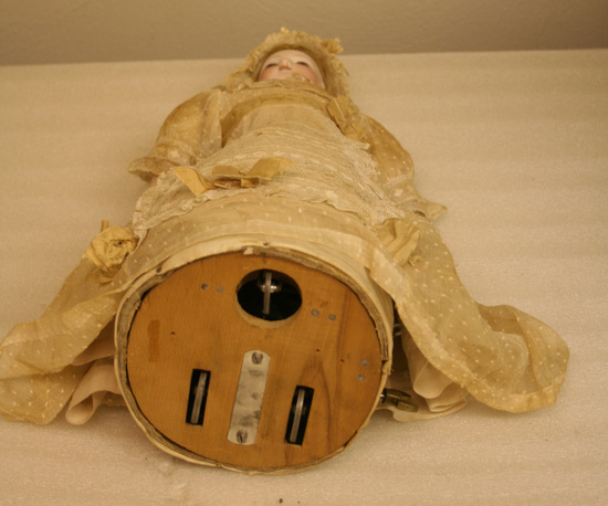 Doll comprised of bisque head, shoulders and arms. Inserted eyes, open mouth showing teeth and pierced ears. Blond hair wig with braid in back. The upper body is made of kid leather. The lower body is a frame work of wood and cardboard covered with stiff cotton which holds the mechanism inside. There are three wheels on the base of the doll which propels it. The wheels are driven by a spring which is wound by a key on the side. The "voice" is made by a lead box covered with leather on the opening and the spring drives air through the leather which makes a noise which sounds like "Mama" or "Papa" The doll is dressed is a polka dotted cotton dress with a panel of lace on the front and decorated with pink silk bows. She has a lace cap on her hhead. The earrings were given by Mrs. Avis Gardiner, a Stamford dealer who bought them in France.