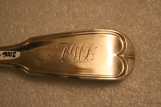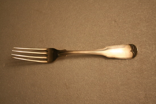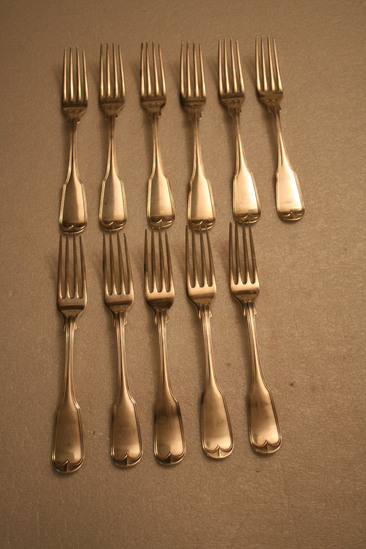 11 silver forks. 4 tines. Tine on the far right is slightly shorter than the other three. Decorative line edge around handle on front, same decorative line edge on back. Maker's mark on back of handle in middle "G.W. & H" Engraved on back of handle "FMD" in script letters