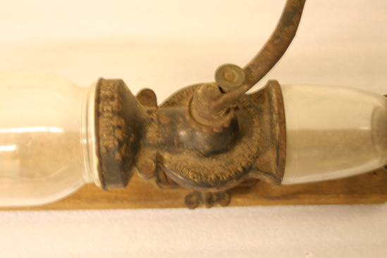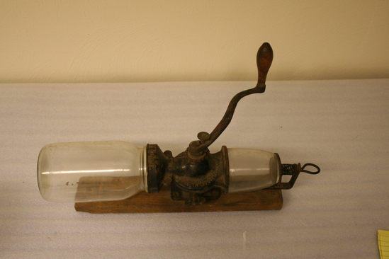 Grinder intended to be attached to wall. Attached to rectangular wooden base Regular quart size mason jar is screwed upside down at top of grinder holds the coffee beans. A spring holds an ordinary jelly glass to the bottom. Crank handle extends from center of mill with wooden handle at end.