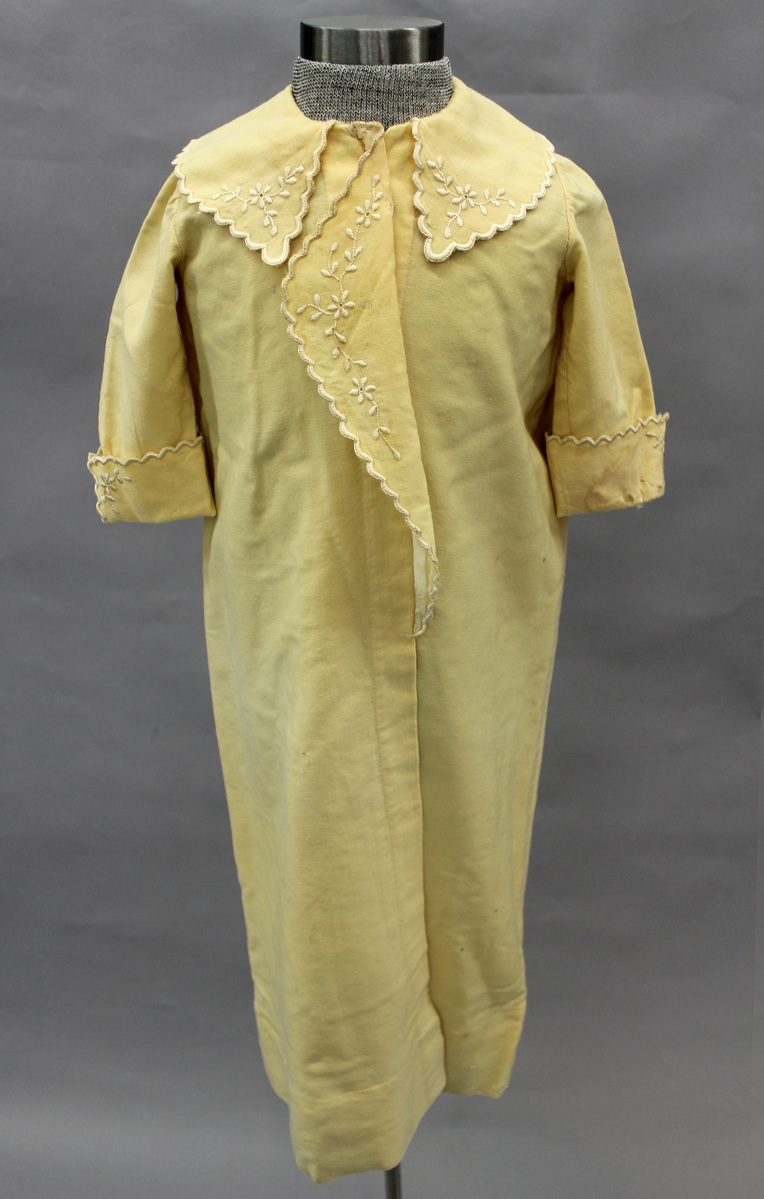 Cream-colored wool child's robe; open down center front; fold over collar with embroidered scalloped edge; rounded flap attached to left side of front opening with embroidered scalloped edge; round flat collar with embroidered scalloped edge; long sleeves with folded back cuffs with embroidered scalloped edge; off-white silk lining; machine and hand- stitched