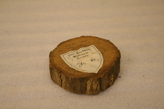 Cross section of a branch from the Charter Oak tree. Bark still remaining on outside.