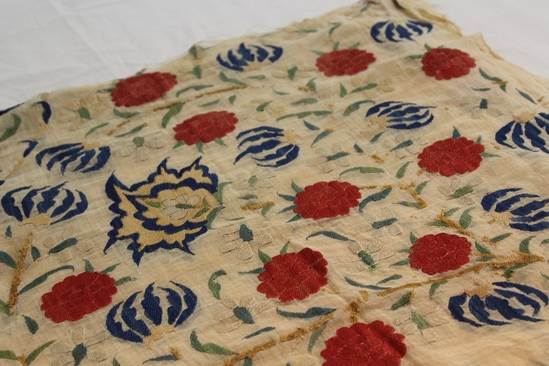 Four squares of fabric that have been sewn together to create one large shawl; cream ground; embroidered floral pattern in red, blue, beige and green; embroidery passes over seam lines