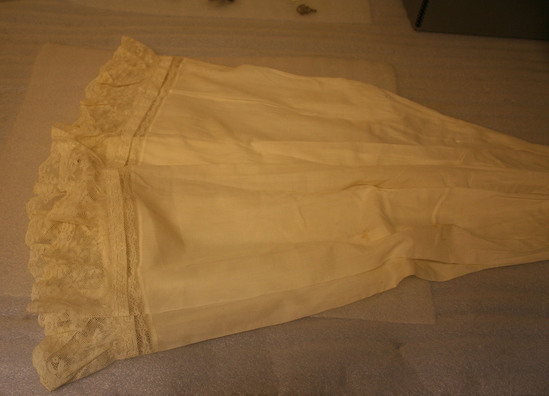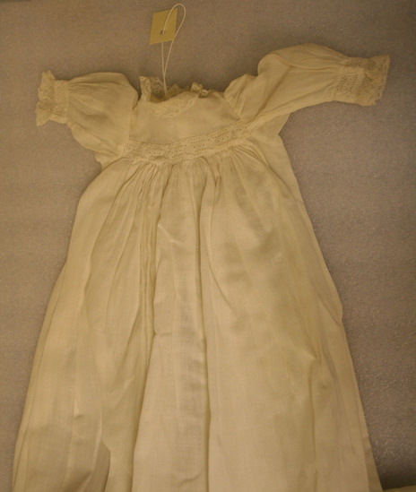 White handkerchief linen doll christening dress with white lace ruffle at hem; embroidered and Valenciennes lace inserts at hem, cuff and waist. Neckline and sleeve edged with valenciennes lace.