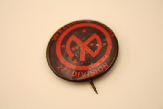 World War I era pin. Round metal button with stick pin on back. Dark red background with a lighter red outline of a circle in the center. At center is the symbol of the 27th Infantry Division, with red stars in the shape of the Orion constellation and a stylized monogram of "NYD" (New York Division). Around the outside of the circle is text "WELCOME HOME/27th DIVISION."