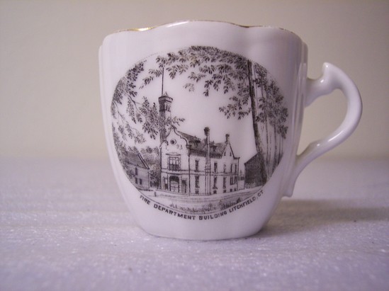 Cup (A) has fluted sides, shaped handle and slightly scalloped rim with gilt edge. Transfer print on one side of "Fire Department Building/Litchfield, CT." Saucer is white with scalloped rim with gilt edge. Black transfer of building with black label stating "Fire Department Building/Litchfield, CT."