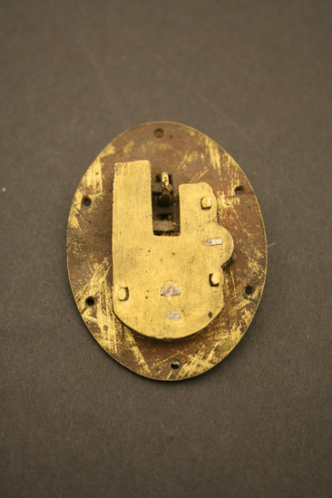 Oval brass lock, key hole at bottom, six small holes evenly spaced around outer edge; shield shaped piece attached at top but loose; backside has locking mechanism but covered by brass plate