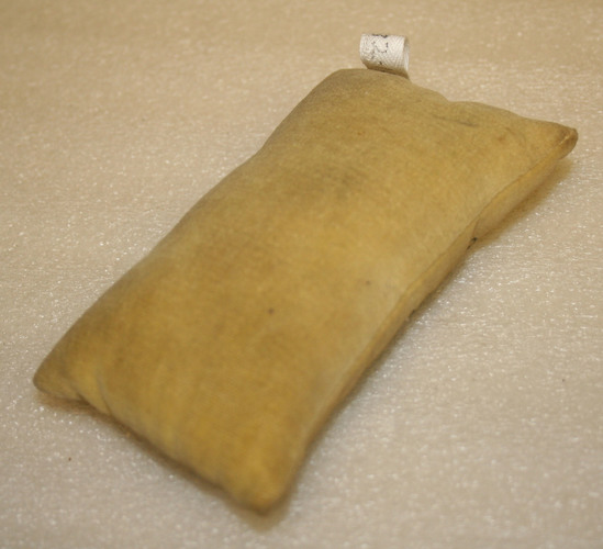 Yellow colored velvet hat smoother. Shaped like a pillow. Maker's label printed in black on one side of smoother.