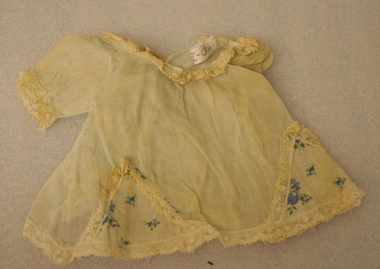 Doll's dress of turquoise and printed linen trimmed with val. Lace. Bateau neck and short ruffled sleeves trimmed with lace. Hem also trimmed with lace. Two triangular appliques of turquoise voile printed in blue and green floral sprigs fastened in back.