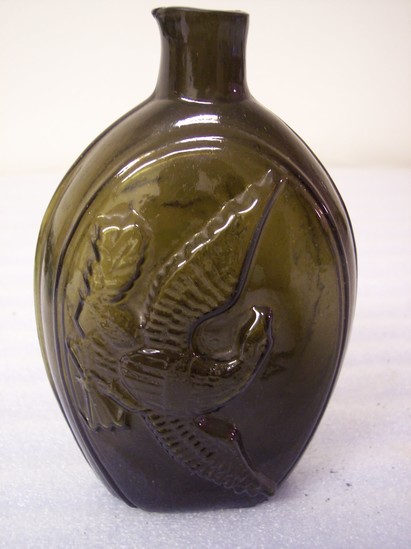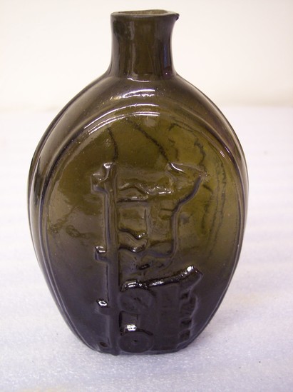 Green glass bottle, pint size, plain lip, pontil mark, vertically ribbed 3, heavy medial rib. Obverse: design on oval panel - horse pulling cart to left on rail, cart filled with kegs. The side of the cart is subdivided into 6 oblong panels; only part of panel appears over each wheel. Reverse: large American eagle, head turned to left; wings partly raised, left foreshortened. Large shield with 6 bars on eagle's breast. Eagle stands on wreath of laurel brances. Above eagle in slightly curved line "Liberty"