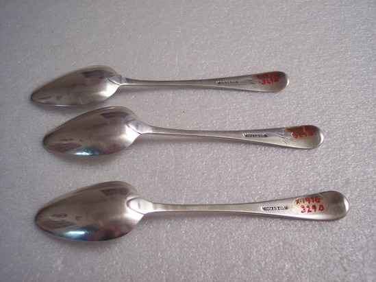 3 silver teaspoons. Engraved on front of handle - bird with letter "L" in script underneath. Hallmark on back "Moulton" Engraved on back of two spoons (a,c) "W"