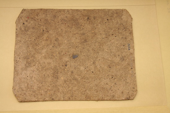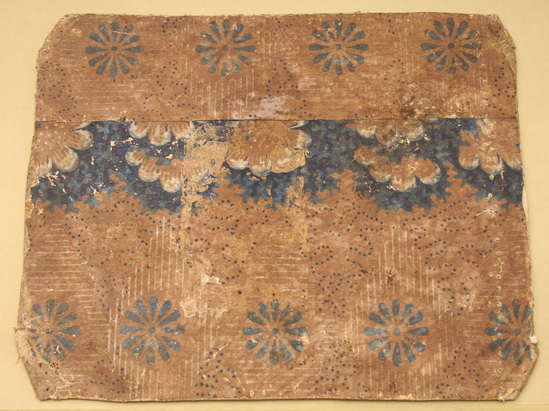 Wallpaper scraps pasted onto cardboard, originally part of a bandbox, possibly the top, used as backing for an embroidery by Mrs. Sally (Sarah Phelps) Pierpont of Litchfield, CT, dated 1849 (CA1890-05-1). Pattern is block print of blue 12-petal flower, surrounded by a diamond shape of alternating horizontal and vertical white lines, interspersed with navy dot outlines of leaf forms. Along seam is border of larger flower.