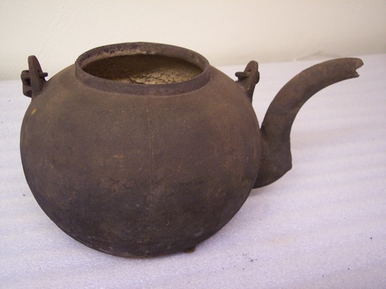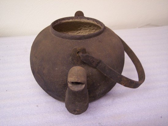 Round pot with collar for lid; three short legs; large base; curved spout; pot cast in four pieces and spout in two; cast handle with mushroom shape with hook ends