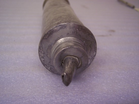 A. Wooden plunger. Cylindrical pewter body b. Screw-on pewter nozzle.