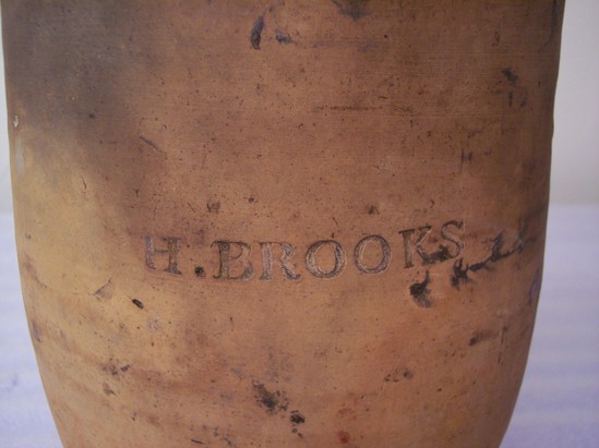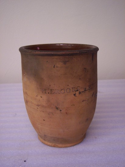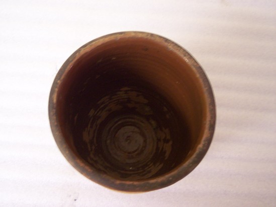 Redware pot with exterior unglazed, interior has brown glaze. Rolled rim, shaped base.