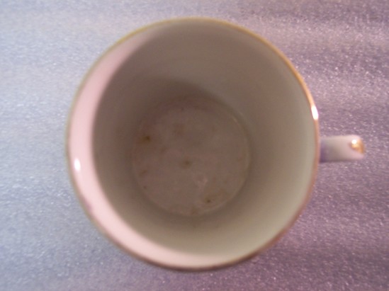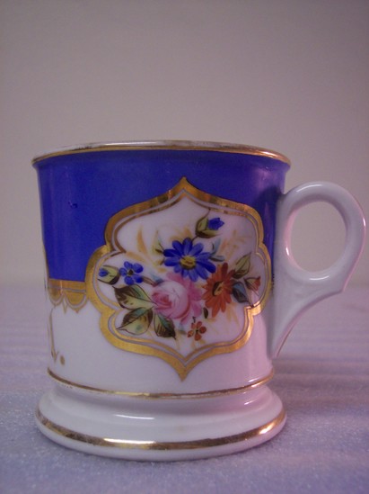 Similar form at 1952-12-2. Gold lines on rim, handle and base. Upper half of body is blue and lower half is white. "J.F. Buel" is written on the front in gold under a half-framed floral bouquet. Two sides have cartouche-framed floral painted sprays. The cartouches are framed in gold.