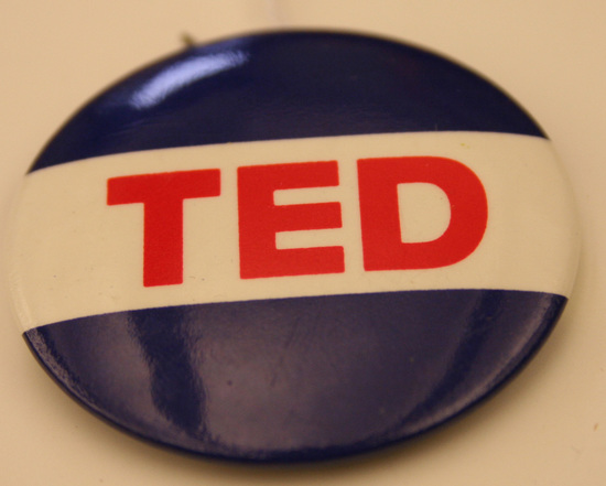 Campaign button. Three horizontal stripes - blue on top and bottom with white in center. In red lettering in white strip "TED"