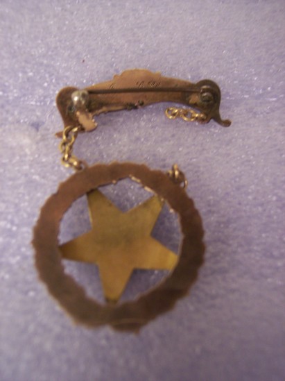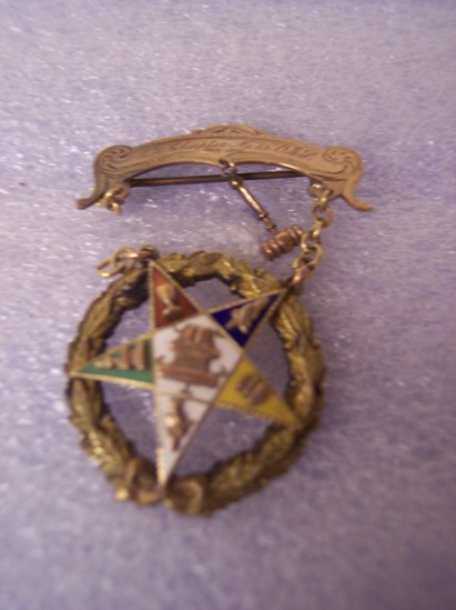 Top pin bar fancy shaped old gold with "E.K. Chapter, No. 75 O.E.S./1912-1913" and other cut decoration. 1/2 gold gavel hangs down. Chain to join star pin broke on one side. Medal: gilt oak leaf wreath with enameled star having various decorations in gold on the points and center.