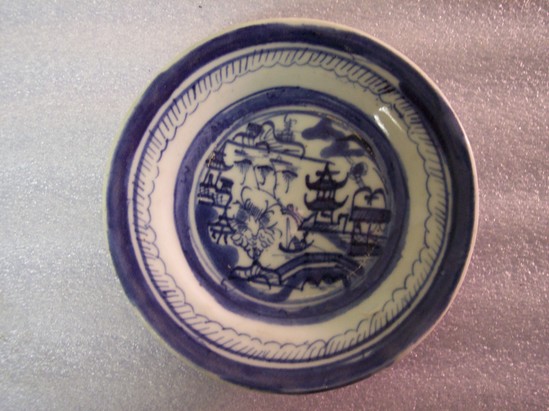 Round plate of a heavier and cruder construction than the saucers from this set. It is standard blue and white "Canton" river scene depiction. Wide blue band around the edge.