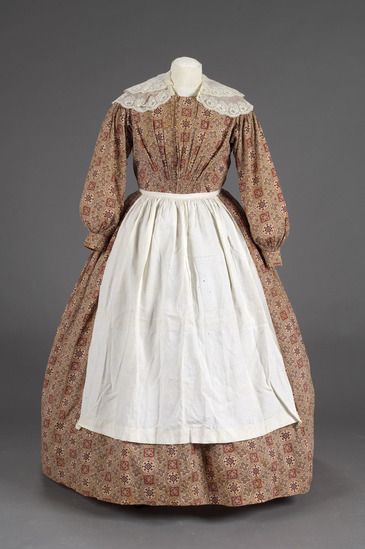 Woman's everyday dress of printed cotton calico, paisley pattern in red, brown and tan. Long tapered sleeves, body lined with muslin closed by 14 brass hook and eyes, open front, below waist on front with two panels of tight gathers (like smocking), high waist, gathered all around waist, ankle length full skirt.