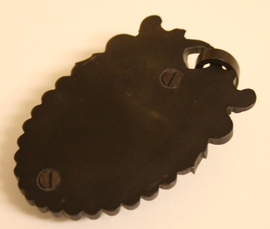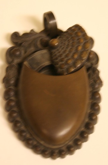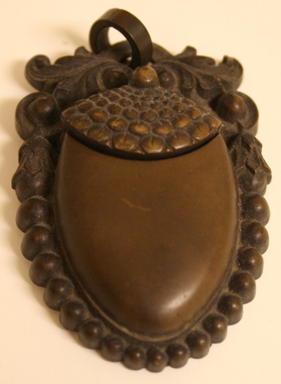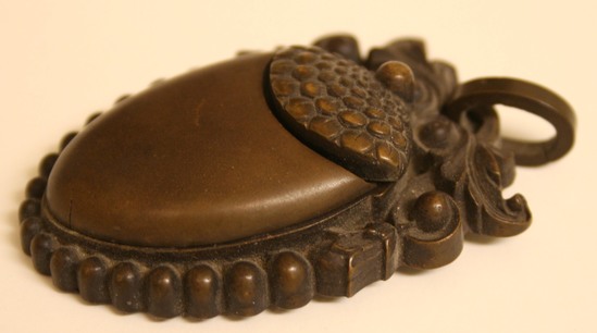 Wooden locket or container. Carved in the shape of an acorn. Top of acrorn hinged to swing from side to side to reveal opening. Beaded border around outside of acorn. Oak leaf at top with wooden ring.