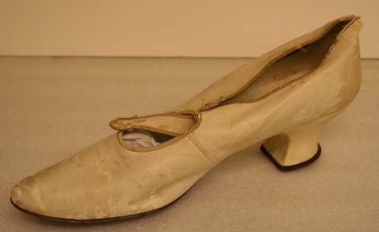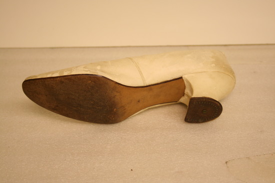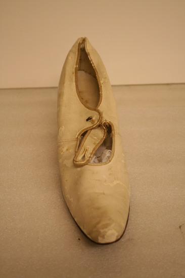 One leather cream colored shoe. The interior of the shoe contains the label "Alexander8th Ave. and 18th St NY" A cream colored ribbon is inside of the shoe. Pointed toe. Short heel