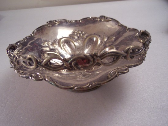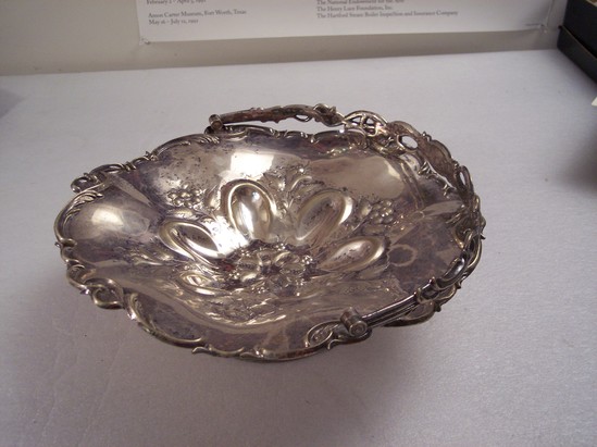 Wide shallow bowl mounted on small pedestal. Handle hinged on two ends of bowl and arches over piece. Piece heavily decorated. Handle pierced and molded design of snakes intertwined around vines. Bottom of bowl/tray has floral design. Edge of bowl/tray decorated with curved vine design