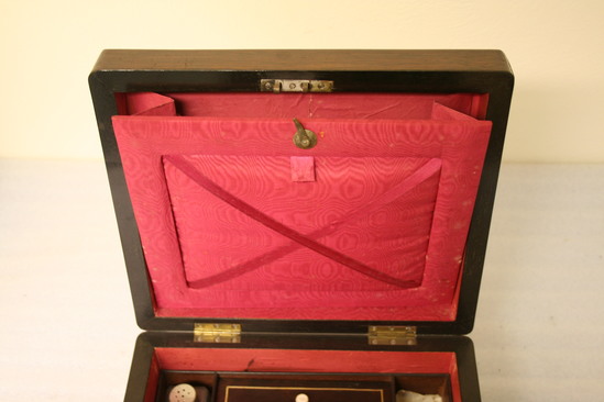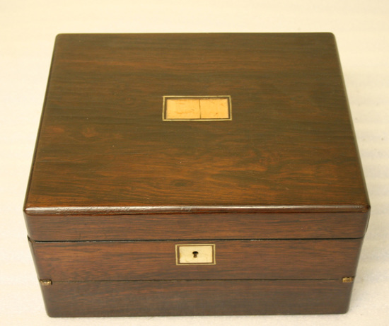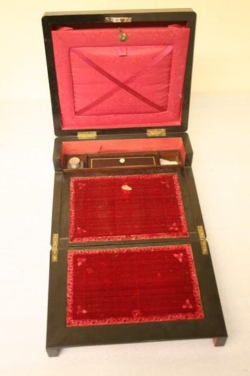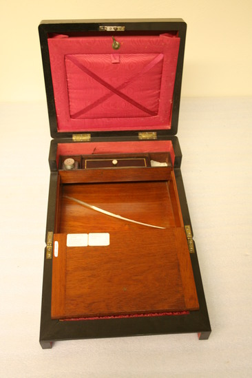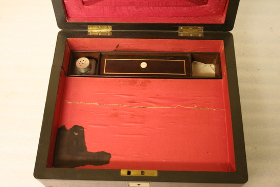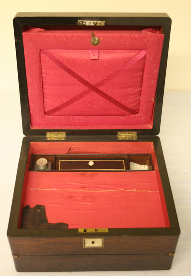 Portable writing desk, rosewood box, mother of pearl oblong inlay in top and thin border of mother-of-pearl surrounding. Sqaure lock plate on side of ivory. Two brass hinges. Opens in three sections, top section fitted with red satin accordian file folder, middle and third section make for slanted writing surface covered in red velvet. middle section opens to letter compartment. Section with inkwell holder, pen holder and sander