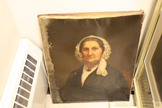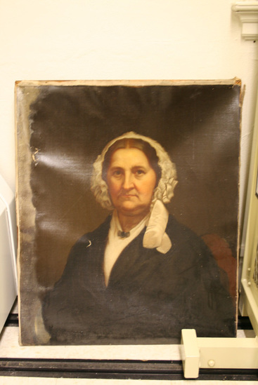 Oil on canvas of Mabel Clark McNeil. Older woman in dark dress with white scarf or blouse at neck. White lace cap with bow/ties on right side on head. Large oval brooch at neck. Portrait executed from chest up. Dark background. Donated framed but has since been removed from frame.