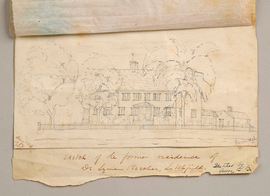 Sketch of Lyman Beecher house. View from the road. Fence in front and trees in yard partially obscuring house. Two story house with large pitched roof. Chimney in center of roof. Doorway covered by small proch. Two additional buildings visible on right side of house. Dated in bottom left hand corner "August 10, 1854" and written on bottom of sketch "Sketch of the former residence of/Dr. Lyman Beecher, Litchfield. /Sketched by Geoge B. Bacon." and written on the back of the drawing "George B. Bacon was a brother of Leonard Woolsey Bacon/pastor of the First Congregational Church of Litchfield and son/of Leonard Bacon pastor of Center Church, New Haven/Given to Litchfield Historical Society by/Mary Bacon."