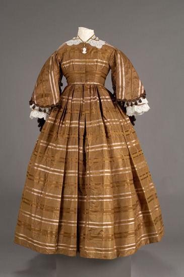 Brown taffeta dress with horizontal bands of brown and fine red stripes; round neck with hook and eye closures down the front; full, elbow length sleeves open on under side with brown tassels along edge; skirt is full and pleated; bodice lining is off white cotton; skirt lining is brown taffeta