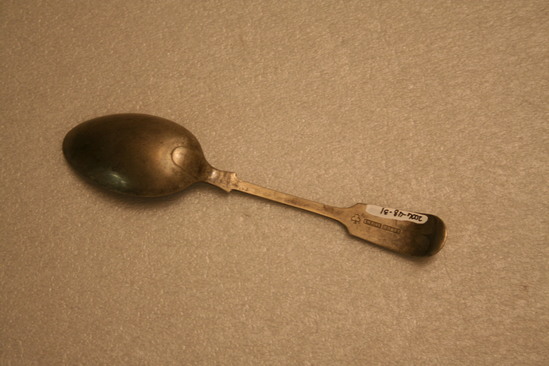 Silver dessert spoon. Oval shaped bowl. Handle thin in middle, widens at ends. Maker's stamp on back - symbol of 3 leaf clover "EMPIRE" and "HB & SS"