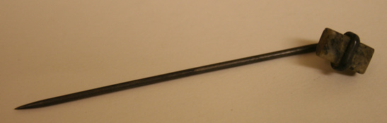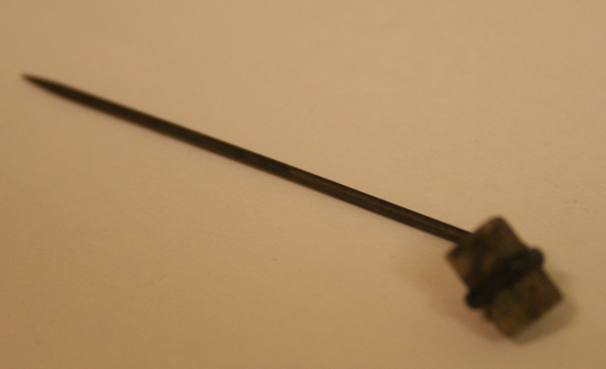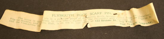 Small piece of cut granite, Plymouth Rock, mounted on steel stick pin. With paper label explaining history of Plymouth Rock.