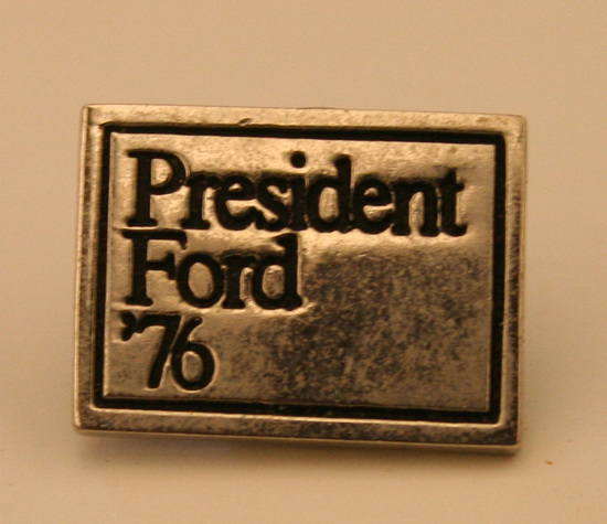 Small silver metal pin "President/Ford/'76" pin with catch on back.