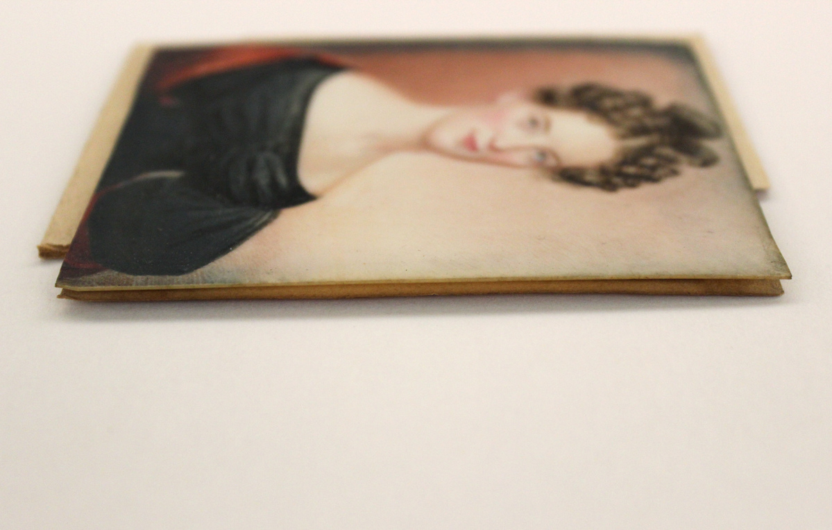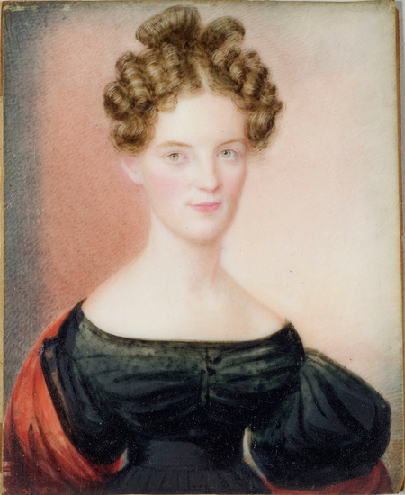 Portrait miniature - unframed. Thin sheet of ivory. Watercolor of young woman from waist up. Brown curly hair piled on top of her head. Light brownish/green eyes, sloped shoulders. Black dress, wide neckline, rushing across chest, large puffed sleeves, cinched at waist. Red shawl. Piece of cardstock glued to back of miniature, torn on one side.