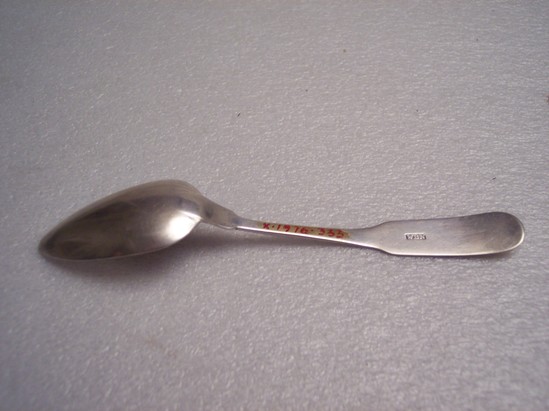 1 silver teaspoon. Script on front of handle but illegible. "WBN" in rectangle on reverse of handle