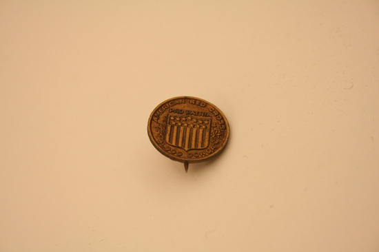 Small round pin, stick pin on back, molded design on front, shield with stars and stripes design, around outer edge "American Red Cross/Blood Donor"
