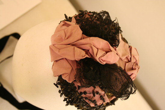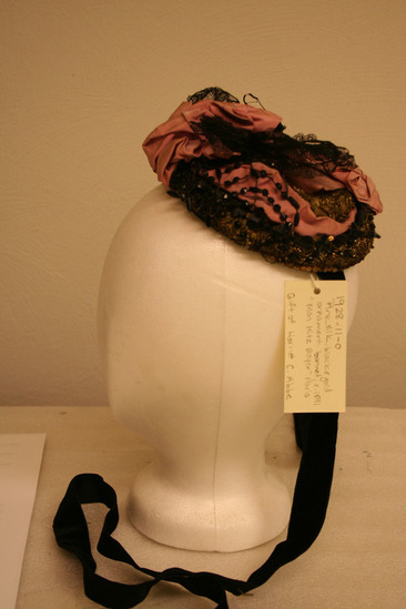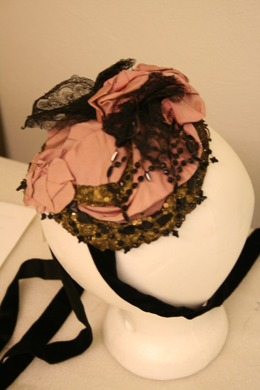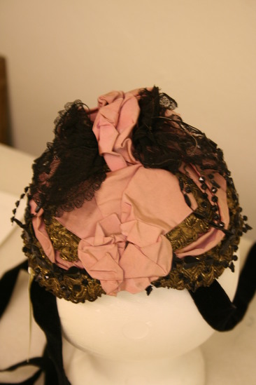 Flat, circular shape; a gold frame with sequins with pink ribbon in bows in center of front and back; black lace also in center in wing shape; black beads around sides and front; black velvet tie ribbons; label "Mon. Heitz-Boyer/28 Place Vendome Paris"