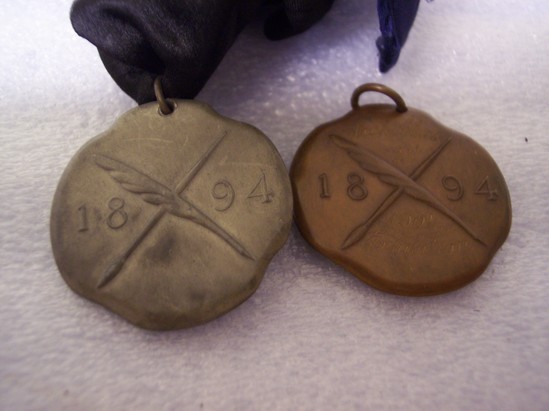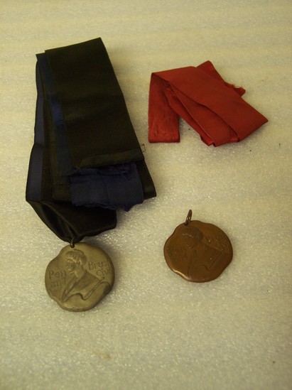 A: Bronze medal, irregular round shape, bust of woman on front with words "Pen and Brush Club" On back side images of quill pen and paint brush crossed in center. "1894" printed in large font across center. Etched above and below image "Arch. Class/2nd" and "1904 Exhibition" Long red silk ribbon B: Same as above except medal made of pewter with long blue silk ribbon. No inscription on back.