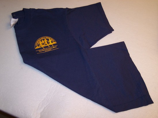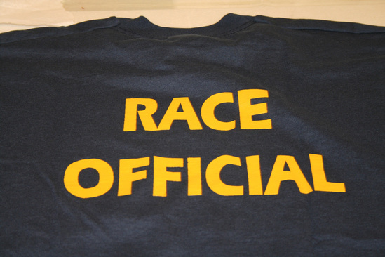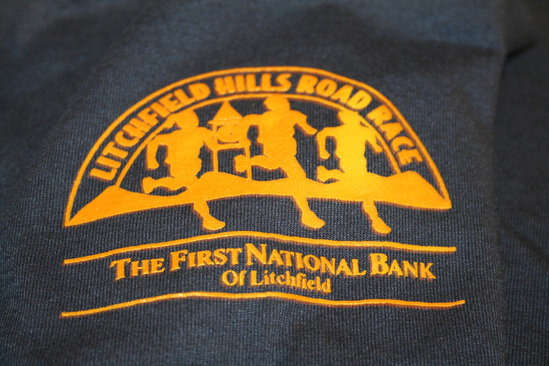Navy blue short sleeve T-shirt. Logo printed in yellow on upper left hand front side of shirt. Arch with "Litchfield Hills Road Race" printed inside of arch. 3 runners underneath with tower or steeple in background. Underneath logo is "The First National Bank of Litchfield" printed in yellow. "Race Official" printed in large block letters across back of T-shirt.